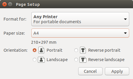 The page setup dialog contains controls for paper size (letter, A4, A5 etc.), orientation (landscape or portrait), and, only under Windows currently, controls for setting left, top, right and bottom margin sizes in millimetres.